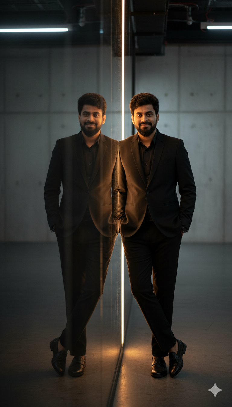 A cinematic fashion editorial portrait in 9:16 vertical aspect ratio of a stylish young man leaning slightly against a large reflective glass panel in a sleek urban studio setting, his face exactly matching the reference image without any changes—100% identical facial features, structure, and details preserved—captured with a soft confident smirk and one hand casually tucked into his pocket, exuding effortless sophistication. He wears a impeccably tailored all-black suit with sharp lapels, slim-fit trousers, and polished black loafers, the fabric's subtle texture highlighted by warm rim lighting that carves dramatic depth and golden highlights along his silhouette and the glass's edge. The reflection in the panel cleverly captures a double perspective, mirroring a subtle side profile that adds layers of intrigue and narrative tension to the composition, rendered in ultra-detailed, moody high-contrast tones with a glossy filmic sheen, evoking timeless elegance and introspective allure.