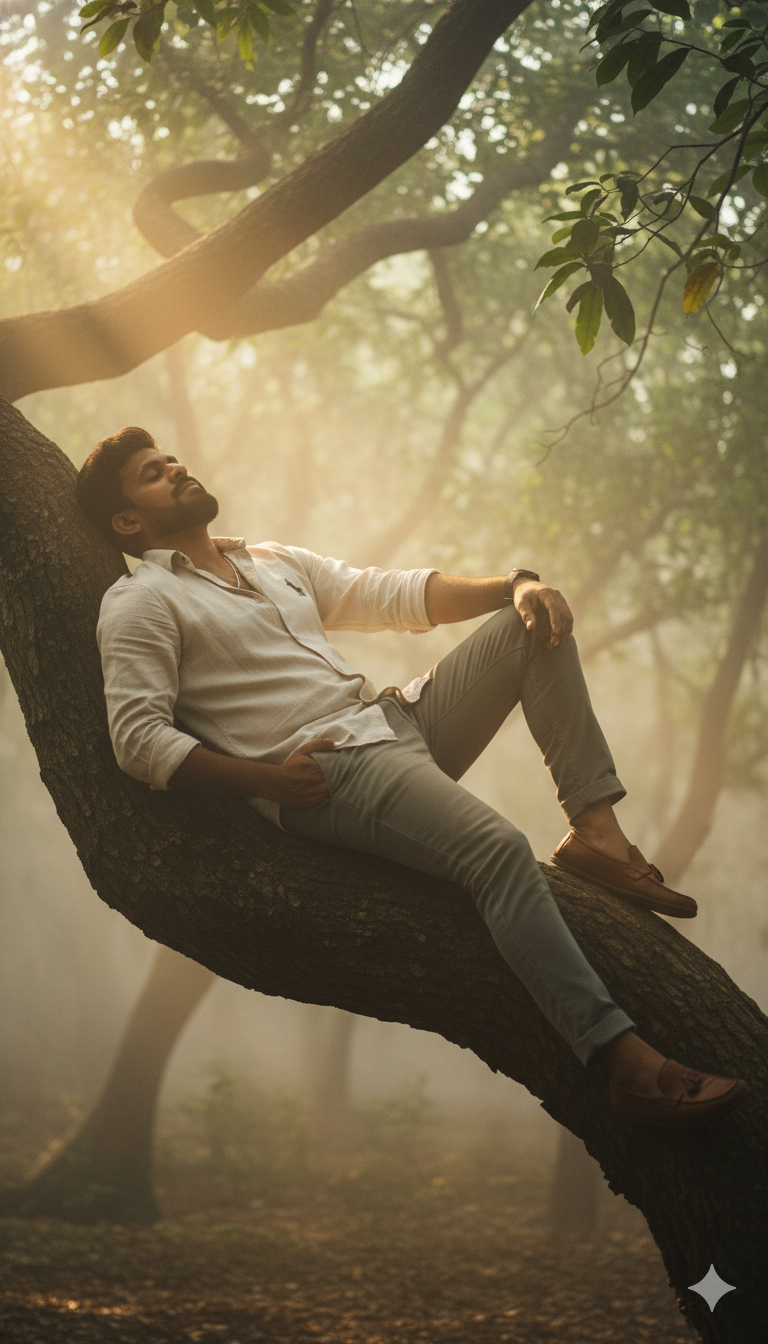 A cinematic portrait of [same man as uploaded photo, same face, same hairstyle], standing in a lush green forest with sunlight filtering through tall trees. He is dressed casually, hands in pockets, with a calm and confident expression, blending harmoniously with nature, with a pet wolf.