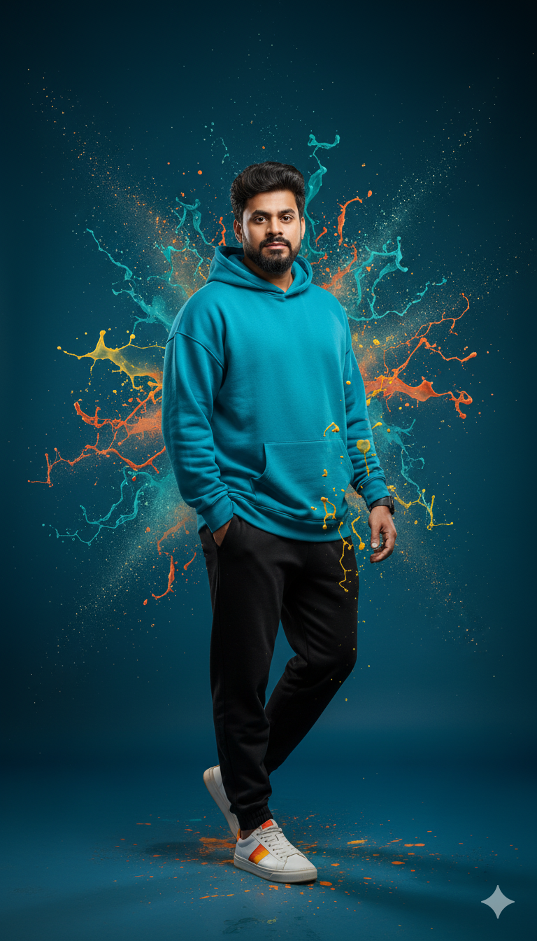 A hyper-realistic wide-angle studio photograph of a man with specific facial features: dark wavy hair styled upwards and swept to the right, thick well-defined eyebrows, dark almond-shaped eyes, straight nose, full lips, and a neatly trimmed dark beard and mustache. He is captured in a simple, straightforward pose - standing confidently with a slight contrapposto stance, one hand casually in his pocket and the other relaxed at his side, facing directly toward the camera with a neutral expression.He wears an oversized hoodie in vibrant teal blue with a relaxed fit that creates natural folds and shadows, paired with relaxed black sweatpants that taper slightly at the ankles. His footwear consists of clean white sneakers featuring orange and yellow accent details on the sides and soles.Surrounding him, explosive splashes of teal, orange, and yellow paint are frozen in mid-air, creating a dramatic and energetic effect that extends across the frame. The paint appears to be suspended in space around him, with droplets, streams, and mist-like particles captured in a perfect state of stillness, contrasting with the subject's calm pose. Some paint elements are closer to the camera, creating depth in the composition.The background is a clean, seamless deep teal blue studio backdrop that gradually transitions to darker shades at the edges, creating a sense of depth and focusing attention on the subject. The floor reflects subtle hints of the paint colors and the subject's silhouette.Professional studio lighting creates dramatic highlights and shadows, emphasizing the textures of the clothing fabrics, the glossy shine of the paint splashes, and the subject's facial features. The lighting setup includes main key lights from the front, rim lights that create a subtle glow around the subject's silhouette, and accent lights that catch the edges of the paint droplets, making them appear luminous.The wider composition shows more of the studio space and the full extent of the paint splashes, with the subject positioned slightly off-center to allow the paint elements to create visual balance. The overall aesthetic evokes a high-fashion streetwear editorial with a vibrant, energetic mood despite the subject's calm demeanor, creating an interesting visual tension.The photograph has ultra-high resolution with sharp details and rich color saturation, particularly in the teal, orange, and yellow tones that dominate the color palette. The man's face must be 100% identical to the reference image, with absolutely no alterations to his facial features, expression, hair style, or beard.