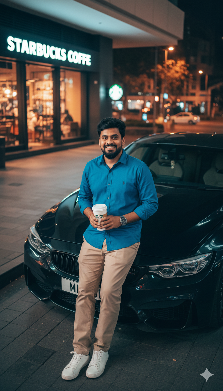 Overhead full-body shot of young businessman leaning on BMW M4 hood, holding coffee and phone. Crisp blue shirt, beige trousers, Puma sneakers, luxury watch. Night by Starbucks with warm smile, soft bokeh, natural light, shallow depth, cinematic teal-orange grade, 8K detail. Face should match with attached image.